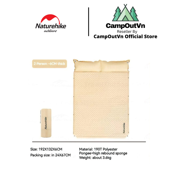 Đệm tự bơm hơi kèm gối D01 Naturehike CNK2300DZ014 dày 6cm và có thể ghép nối tùy theo số lượng người. Nâng cấp độ dày lên 6cm vừa chống ẩm, vừa thoải mái hơn và tác động của đệm tốt hơn giảm tiếng ồn khi xoay, lật người. Thiết kế bề mặt khay trứng giúp giảm áp lực lên các bộ phận của cơ thể và thoáng khí hơn. Nhỏ gọn và nhẹ đi kèm túi đựng giúp lưu trữ gọn gàng và thuận tiện cho việc di chuyển thích hợp cho các chuyến đi cắm trại, dã ngoại.